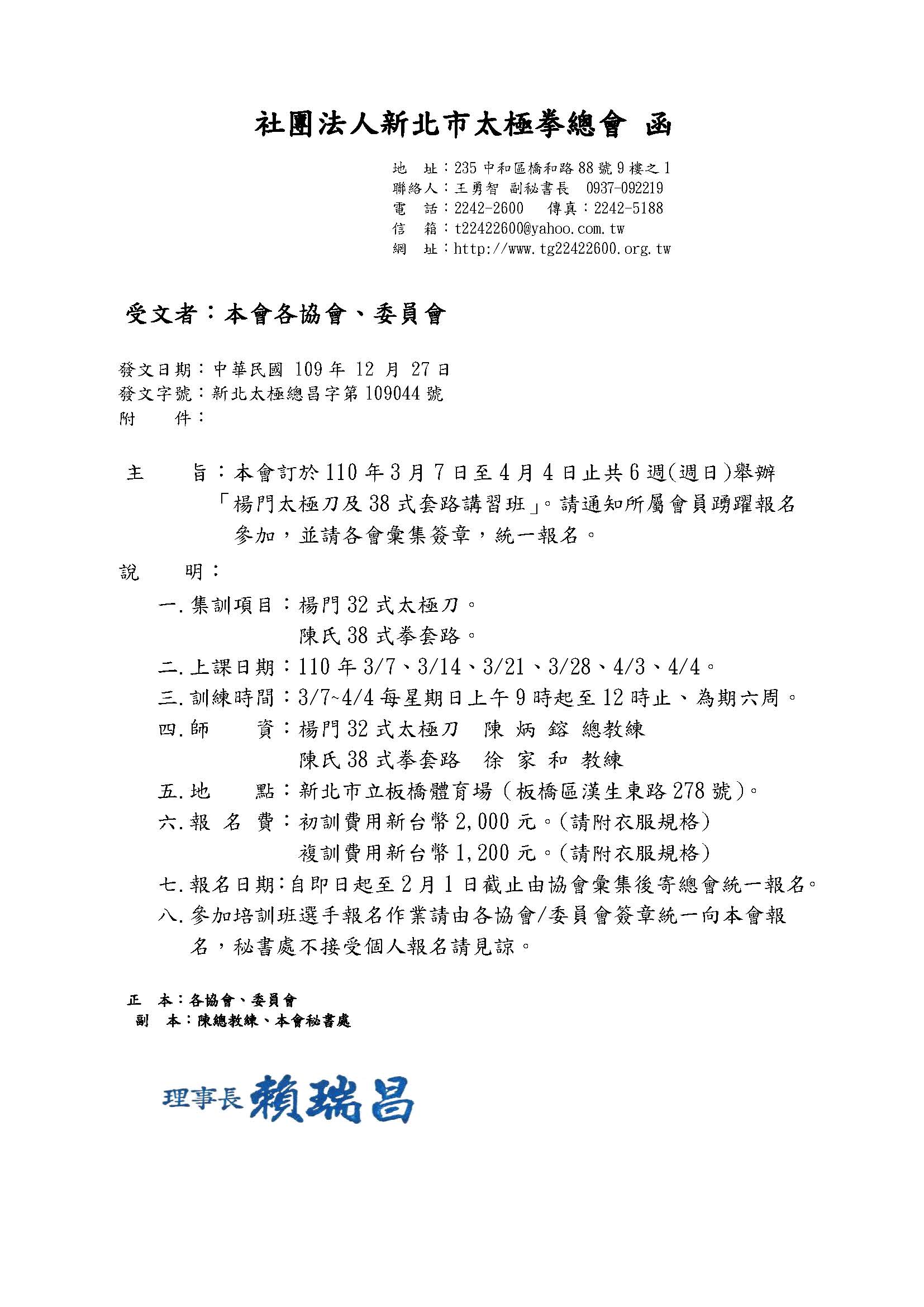 本會訂於110年3月7日至4月4日止共6週(週日)舉辦 「楊門太極刀及38式套路講習班」。請通知所屬會員踴躍報名 參加,並請各會彙集簽章,統一報名。 2021-01-05 tg22422600 教學活動資訊, 最新消息 0 各項訓練共用表格_21N