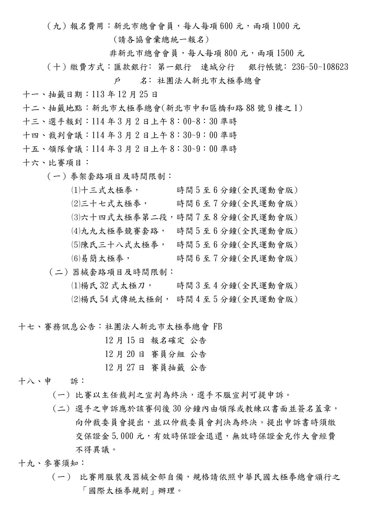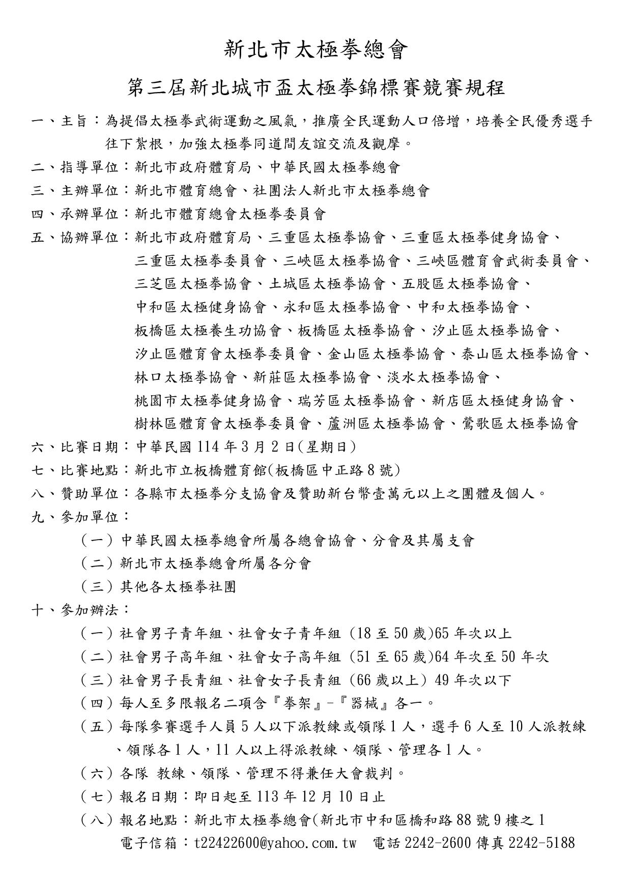 114年 第三屆新北城市盃競賽規程 2024-10-30 tg22422600 最新消息, 比賽資訊 0 114年第三屆新北城市盃拳架及器械 個人比賽 報名表 240914 114年城市盃報名表 – 外縣市 241025